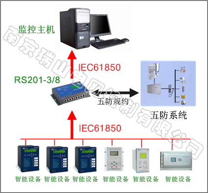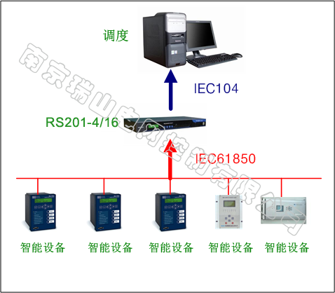 RS201规约转换器使用范围及方式很多,其典型应用结构如下,OPC方式与IEC61850方式类似,不重复举例说明了: