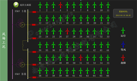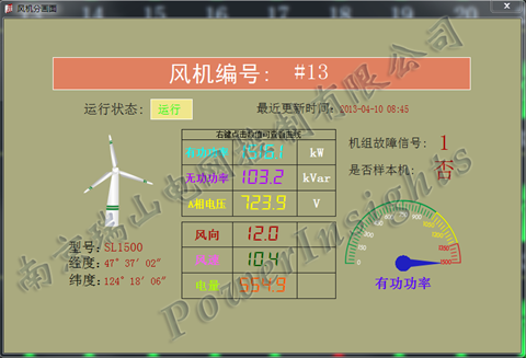 2、实时显示各机组的发电功率、累计发电量、发电小时数,风轮及电机的转速和风速、风向等;
