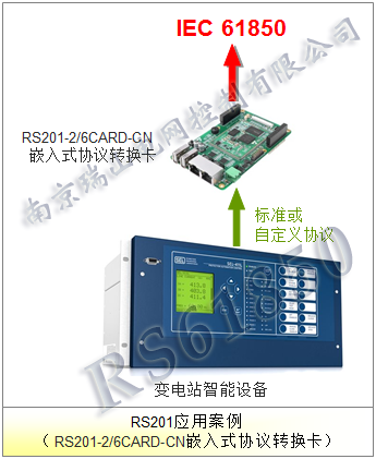 RS201-CARD协议转换卡为可嵌入智能装置内部的板卡,可使原本不具备IEC 61850规约的智能装置对外提供IEC 61850规约服务。 本方案实际上与协议转换器是一样的,只是这个隐藏在用户装置内部,集成性更好,能以一个智能装置整体形象提供给用户。