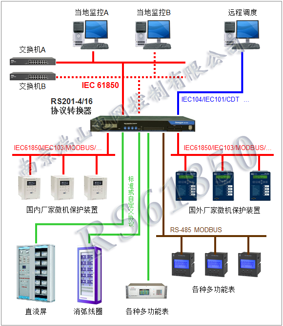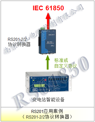 当然,RS201协议转换器也可以反向转换,即把IEC61850规约转换成用户需要的规约。总之RS201协议转换器是很灵活的,可以各种转换,也可以同时转换出几种规约,比如同时转换出IEC61850和IEC104. 可参看以下典型示例。