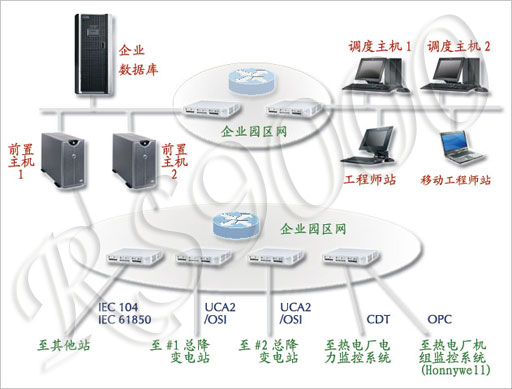 两个总降变电站和已改造完成的6kV变电所及配电间都装配有SEL公司的通讯管理机SEL-2032(内插网络通信协议卡SEL-2701),采用美国标准UCA2规约。热电厂电力监控系统为南瑞早期系统,没有实现网络规约,对此我们通过RS-232转网络设备采用部颁CDT规约传至调度。与热电厂机组监控系统Honnywell之间通过国际工控标准接口OPC来相互交换数据。